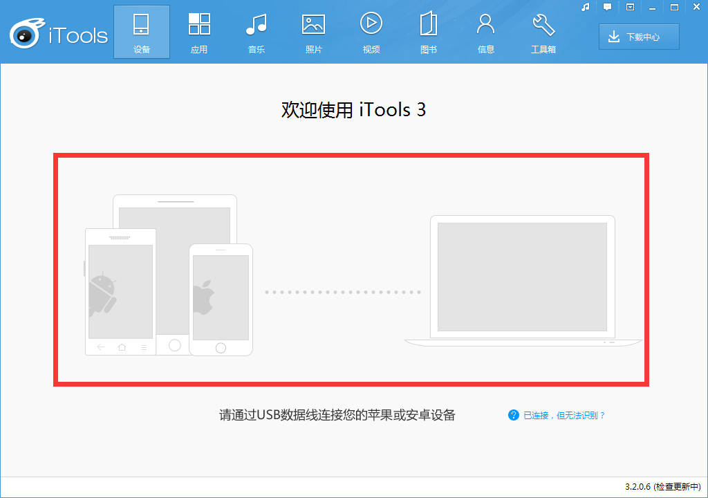 2、将手机通过数据线连接到电脑上,软件会自动检测连接到手机。