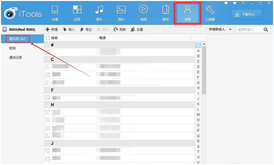 3、在软件界面上点击选择“信息”,即可在左侧看到“通讯录”、“短信”、“通话记录”。